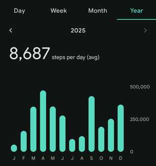 here is a graph of my step count over the year. the lows coincide perfectly with whenever i wasn’t having a good time and my mental was in the gutter. my propensity to keep my tech charged is embarrassing (shoutout to my friends who bear with me when my phone dies mid conversation - sadly not as rare of an occurrence). due to this, the dips are perhaps exaggerated, but overall the numbers paint the bigger picture well.